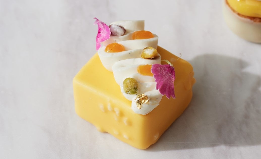 味も見た目もエキゾチックなスイーツ。ナポリ名物の焼き菓子ババにマンゴームースを合わせコクのある仕上がりにしました。デコレーションにはホワイトチョコレートのクリームにアプリコットソース、ピスタチオ、南国色のお花を散らして、トロピカルな甘味と酸味の絶妙なバランスが愉しめるスイーツです。