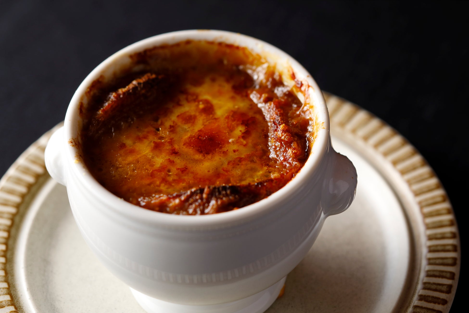 最初の一皿は、RIB ROOMの名物「プレミアムオニオングラタンスープ」