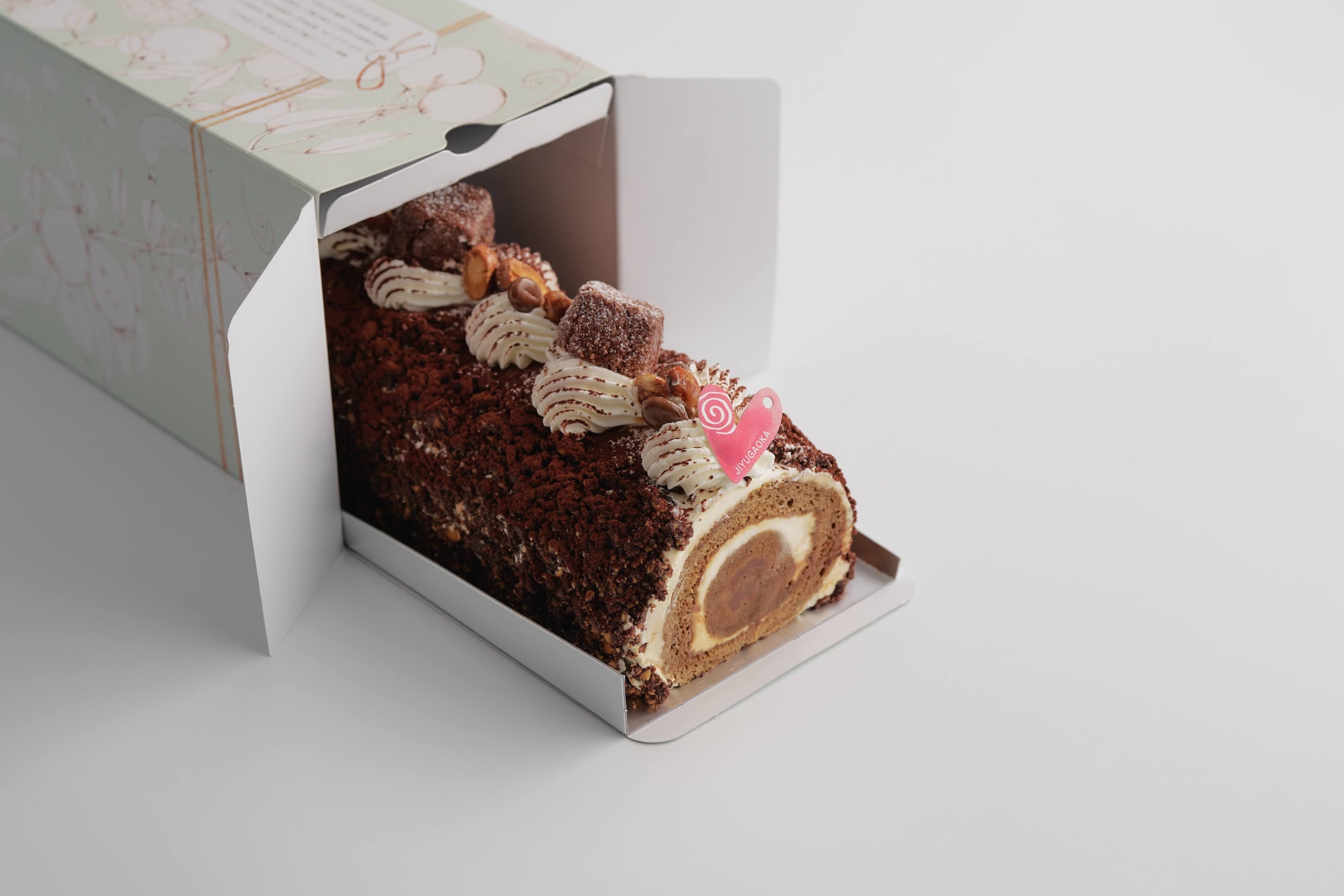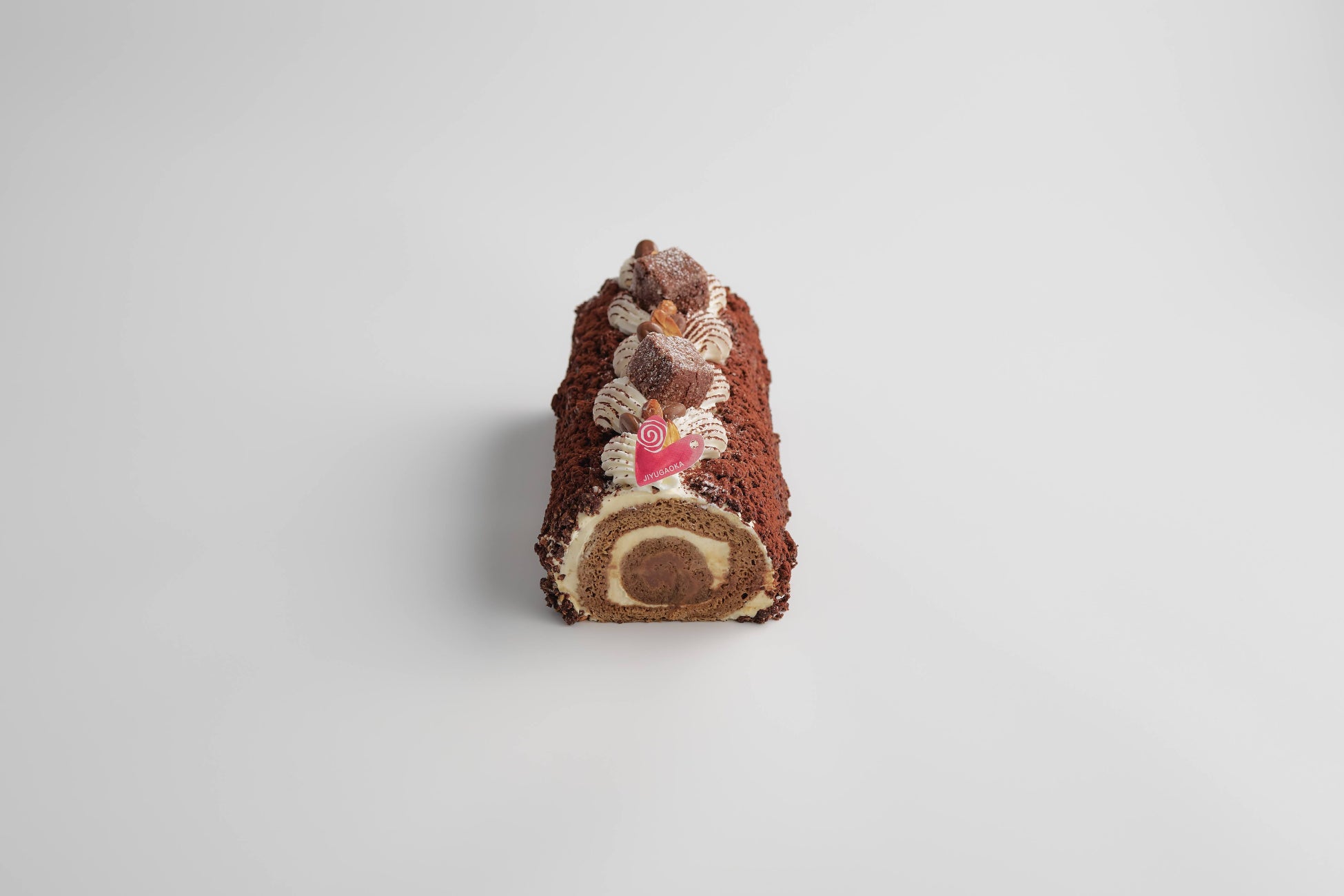 カフェシロップをしっかり染み込ませたシフォン生地でカカオ70%のガナッシュクリームをくるりとまいた