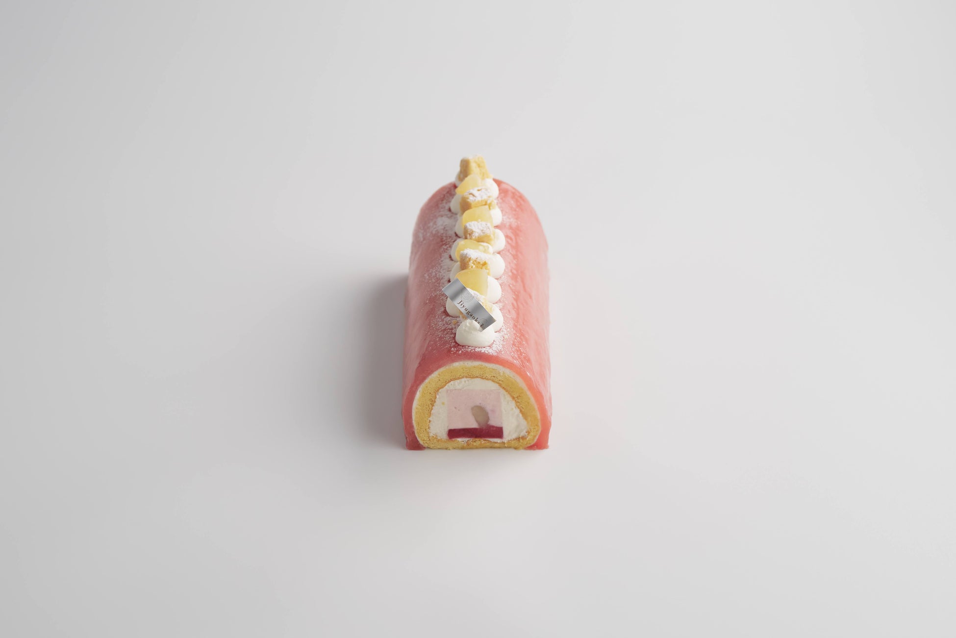 ロールケーキの中心にはパッションフルーツのクリーム、マンゴーのジュレ、熊本県産の渋川栗を散りばめた