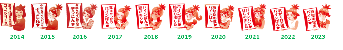 また、2014年からは『パインぱん』のキャラクターをパッケージに採用。毎年、メッセージを掲げた様々なテイストの女の子【パインぱんガール】をデザイン。実は、その年の開発担当者がモデルになることも!?パインぱんと併せて、こだわりのパッケージにもご注目ください。