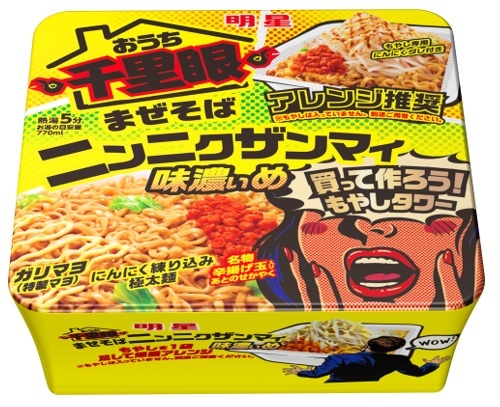 明星食品株式会社(社長:豊留昭浩) は、カップめん「明星 おうち千里眼 ニンニクザンマイ まぜそば」を、2023年7月24日(月) に全国で新発売します。
