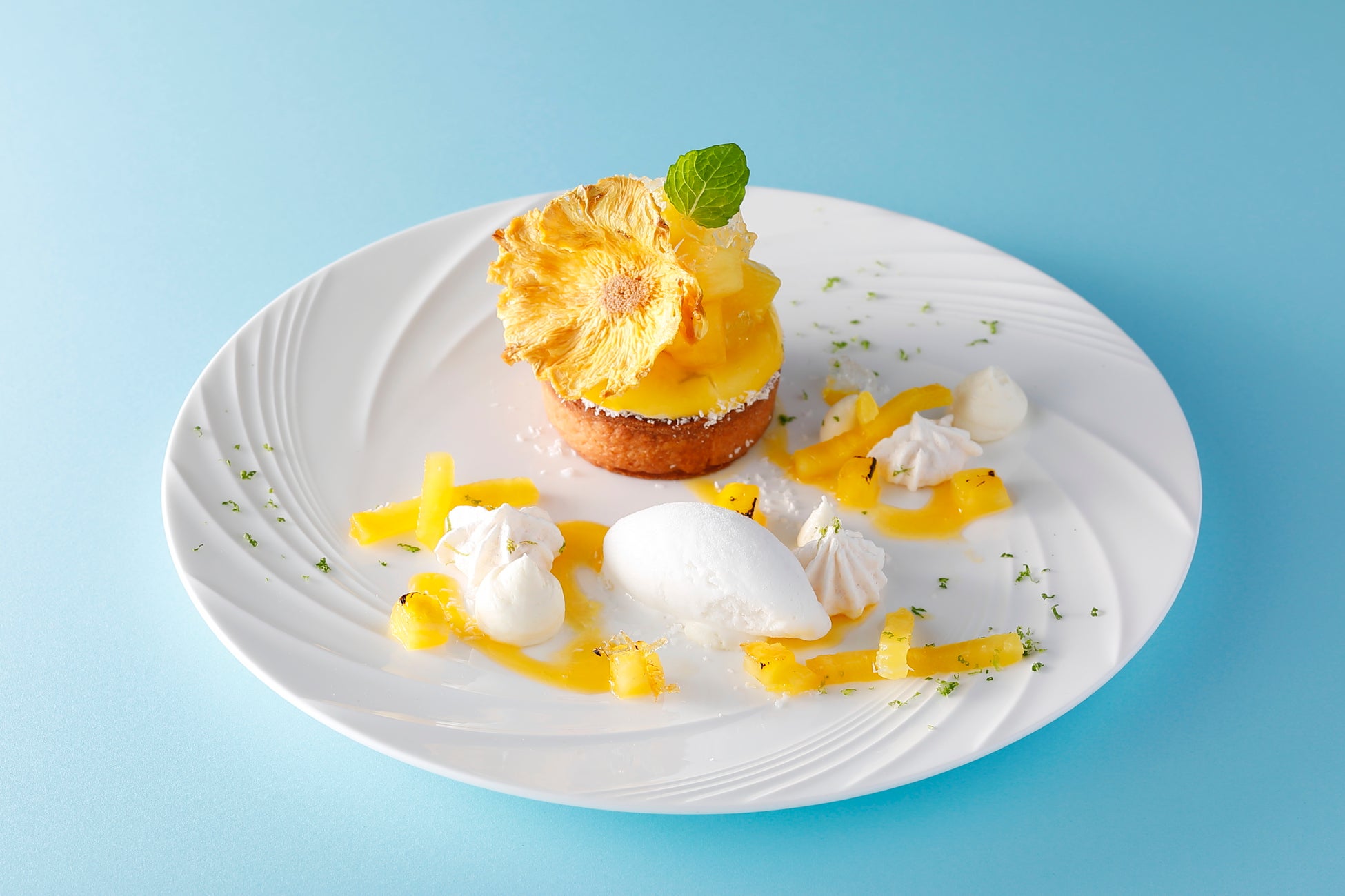 ココナッツ風味のタルトに、フレッシュパイナップル、パイナップルのコンフィチュール、シトロンベールのムースを重ねた夏らしいデザートです。ライムの爽やかな味わいがアクセントになっています。