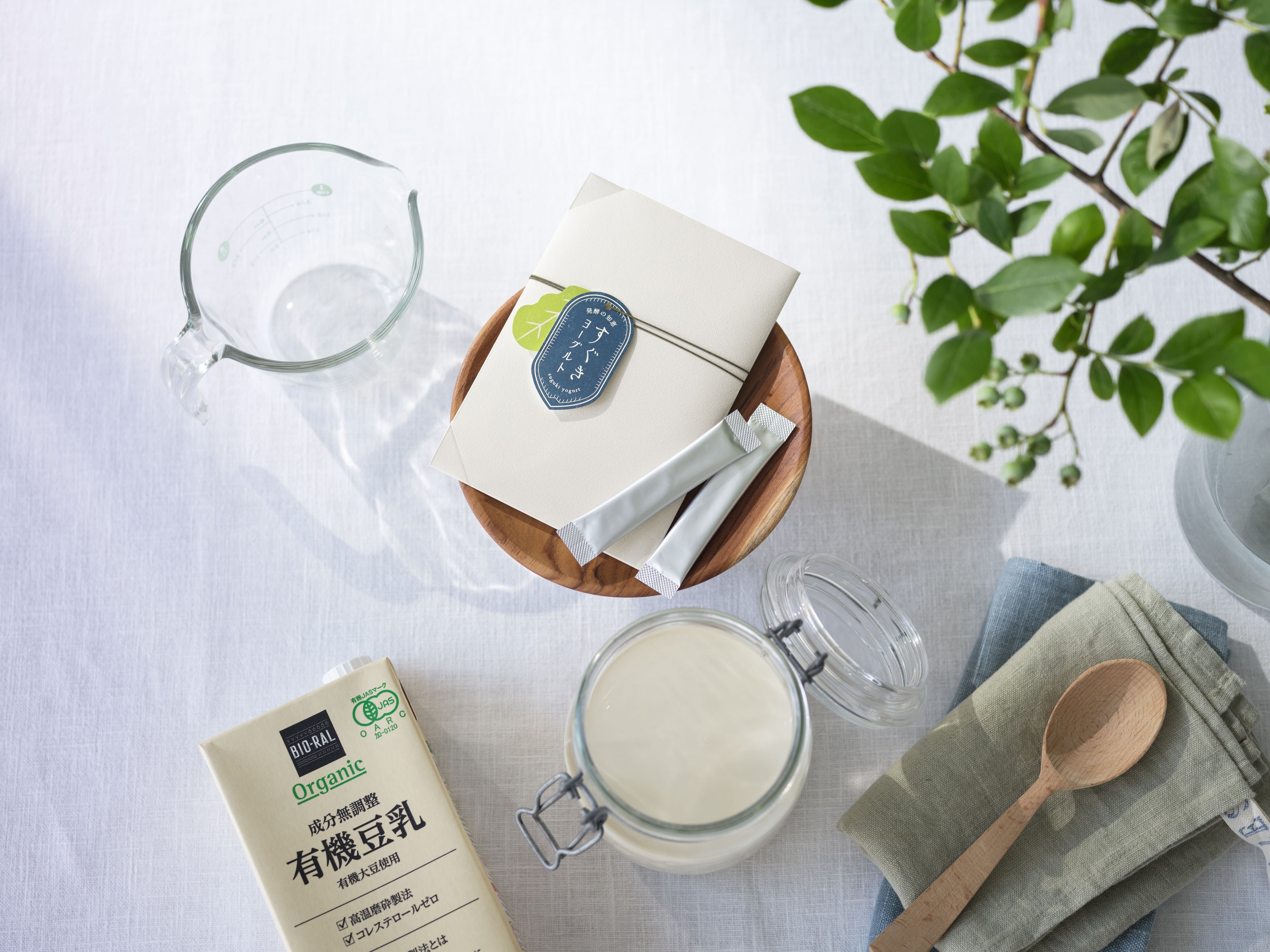 このSUGUKI乳酸菌SOY-1を、こだわりの国産原料で開発したのが、豆乳で発酵する植物性ヨーグルトの種菌「発酵の知恵 すぐきヨーグルト」です。無調整豆乳にすぐきヨーグルトを混ぜて常温で発酵を待つ(※)ことで、家庭で豆乳ヨーグルトを作ることができます。