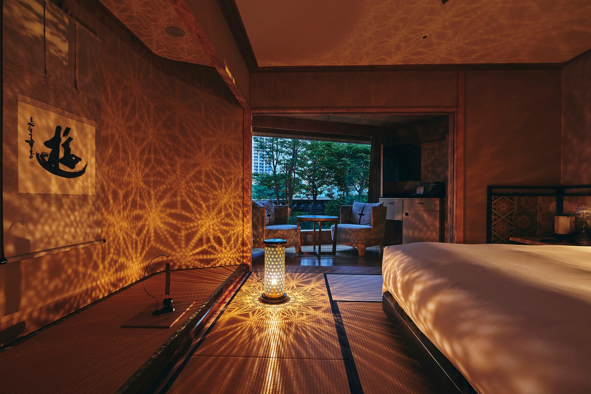 幻想的なあかりをプライベート空間でもお愉しみいただける期間限定のコンセプトルームでは、漉き紙の柔らかなあかりや、籠染灯籠が映し出す幻想的な影が、客室を彩ります。企画展や客室で過ごした愉しい気分をお持ち帰りいただけるミュージアムグッズの特典も。
