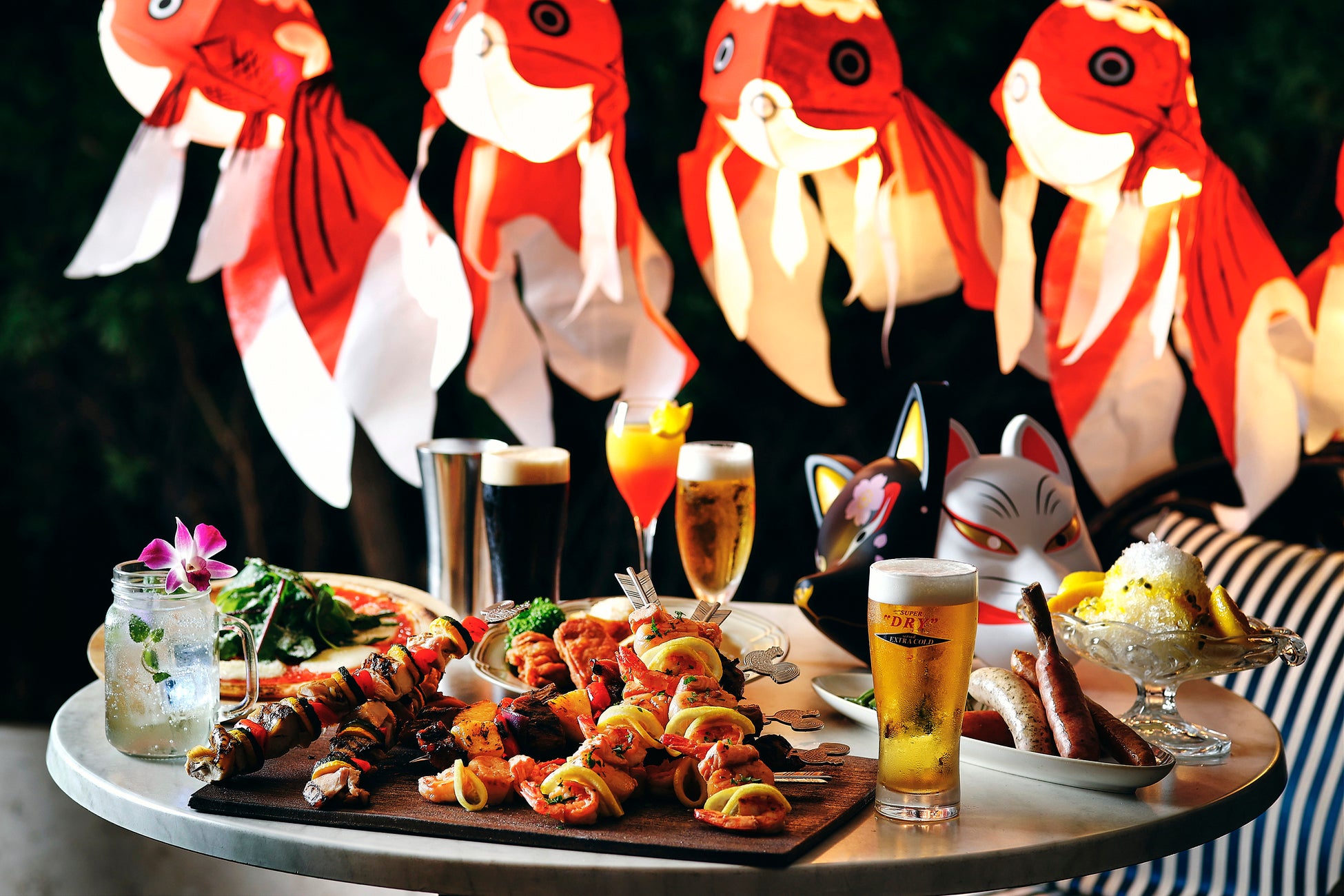 「和のあかり×ビアテラス」のフリーフローメニューは、生ビール、ワイン、カクテルなどアルコール15種に加え、ノンアルコールメニューも10種以上と充実のラインナップでご用意。夕涼みにぴったりなテラス席は、オープンエアでありながら屋根を設けており、天候に左右されずにお過ごしいただけます。緑に囲まれ、心地よい風が吹き抜けるテラスで、夏祭りのような雰囲気をお愉しみください。