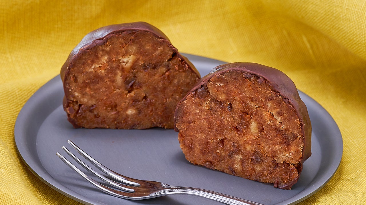 ラムレーズン風味のスポンジケーキをチョコでコーティングした丸形のケーキです。ラム酒が香る大人の味わいです。ちょっぴりラグジュアリーなティータイムにぴったりです。