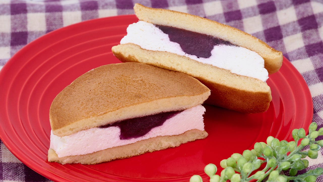 もちもち食感のどら焼き皮でレアチーズ風味のホイップクリームとブルーベリージャムをサンドしました。夏にぴったりな爽やかな風味の洋風どら焼きです。