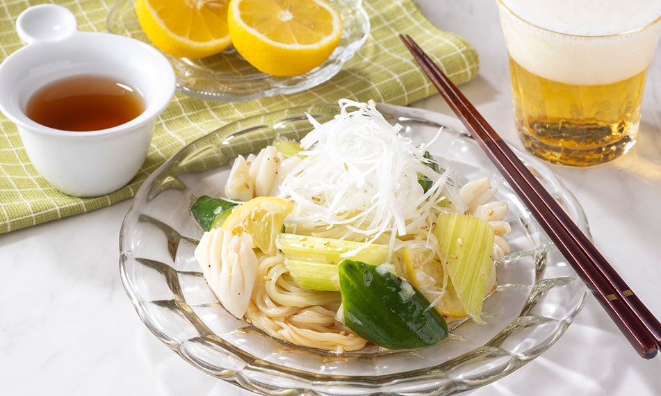 アカイカ、きゅうり、セロリをネギと玉ねぎの塩味ドレッシングで絡め、レモンスライスを加えたさっぱりとしたマリネサラダです。