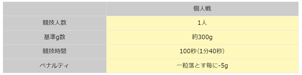 基準g数は公正を期すため競技開始前に皿に盛られた枝豆を 1g単位で計測し、その値を基準値とします。