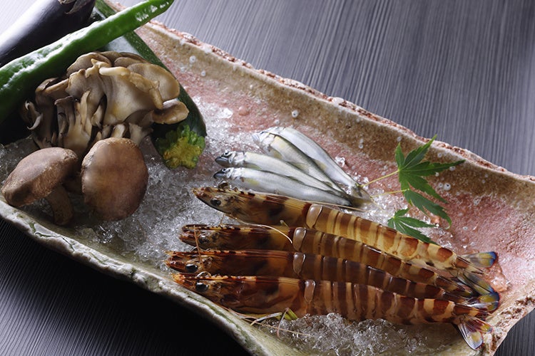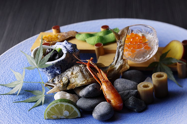美しい水に身をひるがえす小鮎や岩陰にひそむ手長海老など、夏の琵琶湖をそのまま映したような美しい一皿に仕上げました。琵琶湖産のしじみと木耳(きくらげ)の酢味噌和えや比叡ゆば、自家製の鮒ずしも添えられています。湖国のめぐみをお楽しみください。