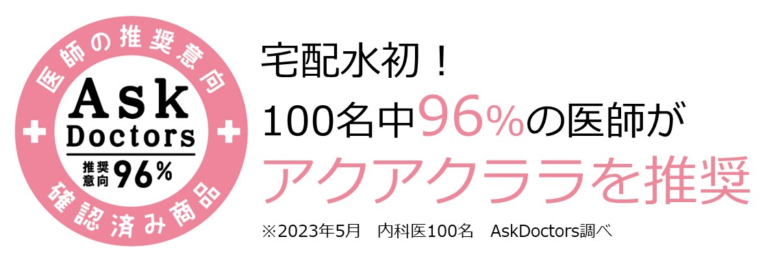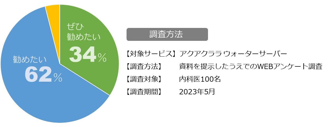 この度、内科医100名を対象に資料を提示したうえでのwebアンケート調査を実施し、96%の医師にアクアクララを他の方に「ぜひ勧めたい」「勧めたい」と回答いただきました。尚、本認証は宅配水業界初となります。