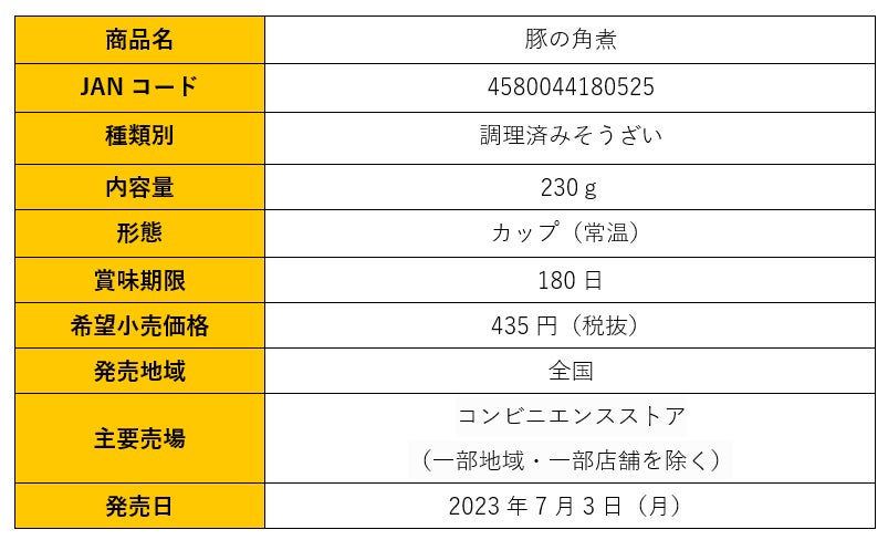 株式会社トーヨーコーポレーション(本社:東京都渋谷区、代表取締役社長:熊谷聡)は、電子レンジで温めて手軽に楽しめるカップ食品『豚の角煮』を、2023年7月3日(月)より全国のコンビニエンスストアで発売いたします。