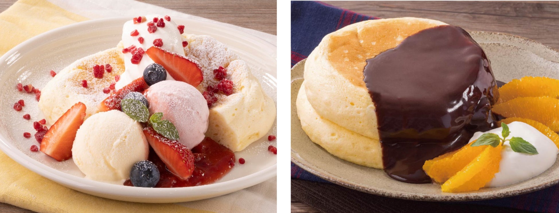 しっとり食感のパンケーキに、2種のアイスと、ストロベリー、ブルーベリー、ラズベリーの3種の果実とベリーソースをかけて爽やかな味わいに仕上げました。