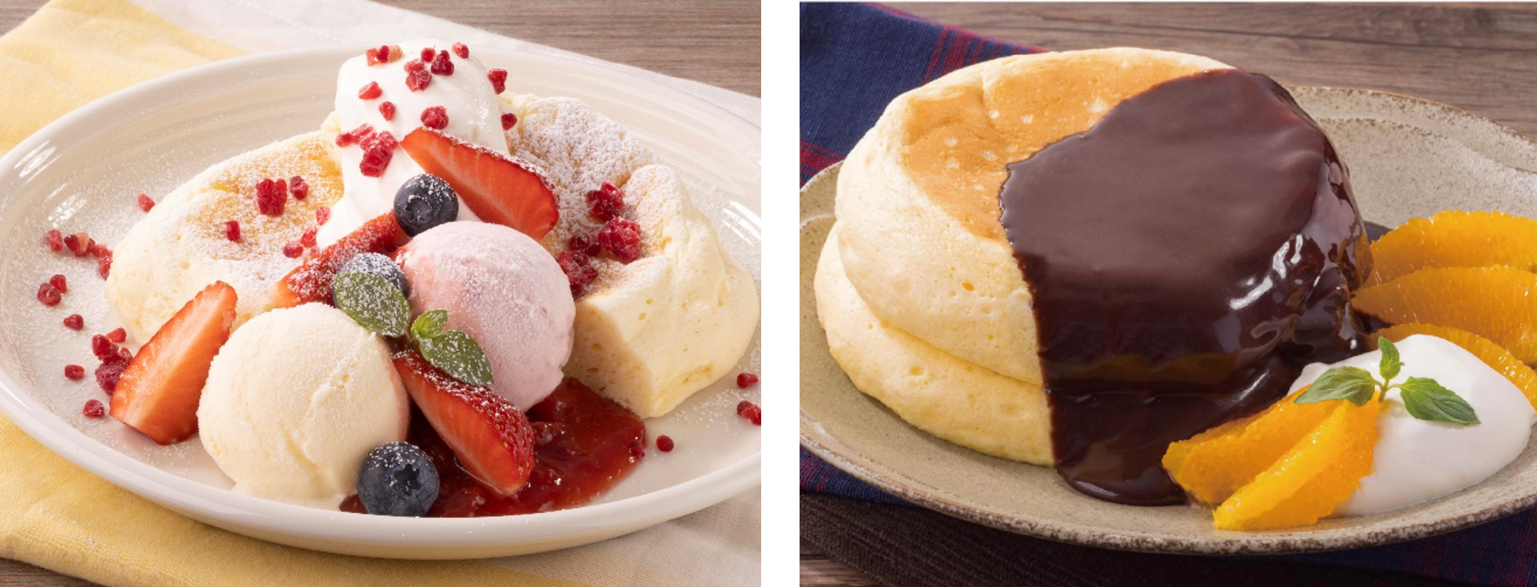 しっとり食感のパンケーキに、2種のアイスと、ストロベリー、ブルーベリー、ラズベリーの3種の果実とベリーソースをかけて爽やかな味わいに仕上げました。