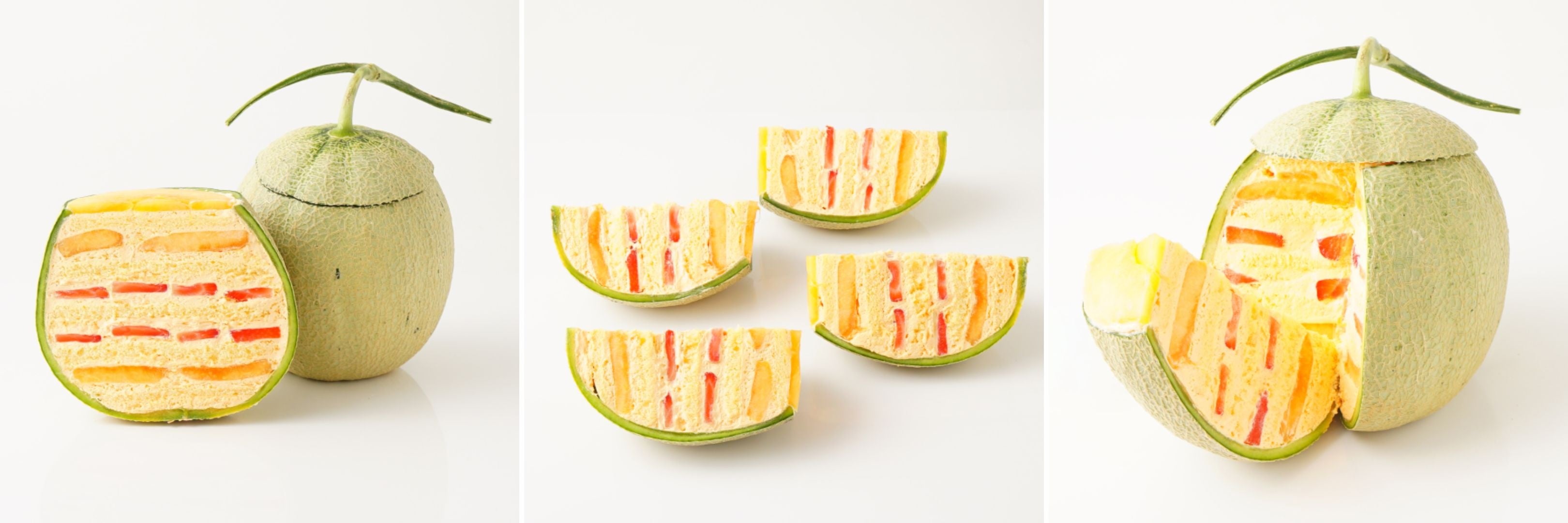 まるごとメロンケーキとは、世界初のメロンケーキ職人であるパティシエ加藤幸樹氏(Atelier Katoオーナーパティシエ)が考案した、メロンをまるごと一個使用し、切ると中からケーキが現れるサプライズスイーツ。届いたときから食べ終わるまでのエンターテイメント性がSNS・テレビなどで話題の人気商品です。