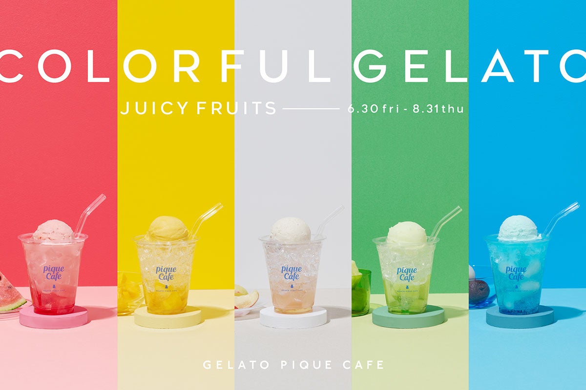 旬を迎えるサマーフルーツ5種(スイカ、マンゴー、ピーチ、メロン、ライチ)を、たっぷりと使用したカラフルなジェラートが新登場。フレッシュな果実とシュワシュワと弾けるソーダが溶け合う、さっぱりとした夏らしい味わいのスパークリングドリンクや、果汁をふんだんに使ったジェラートを盛り付けた、見た目もキュートなアイスフロートもおすすめです。定番メニュークレープへのジェラートトッピングもぜひお試しください!