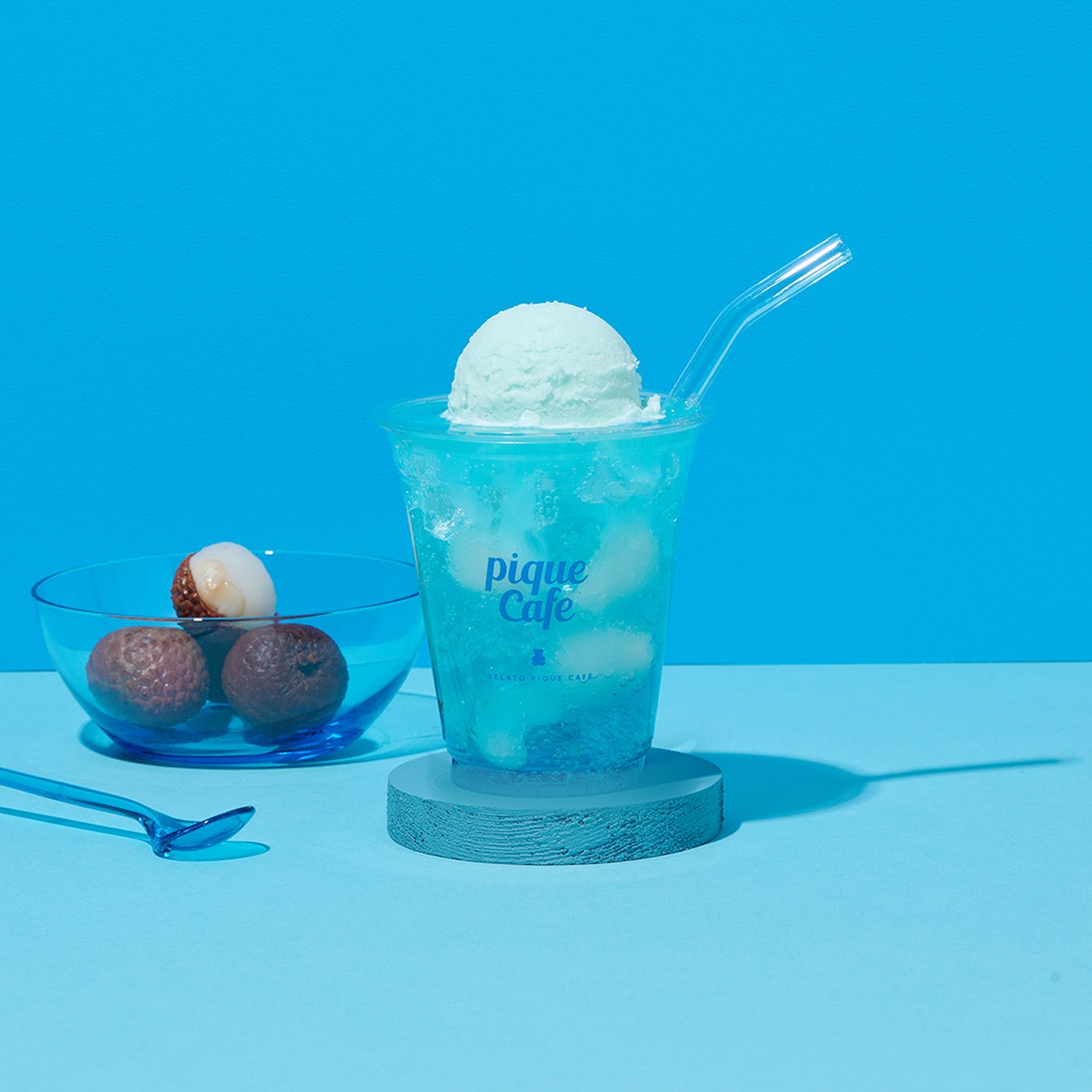 海のような青いソーダは見た目も涼しげな、ライチのみずみずしく上品な甘みと香りが楽しめるドリンクです。
