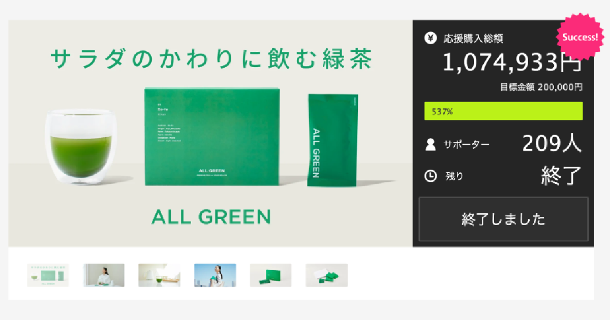 ALL GREENは、緑茶が本来持つ野菜と同等以上の栄養を美味しく補給できる新しい健康習慣を提案する全く新しいスタイルの緑茶ブランドです。この度、Makuakeでの初となるプロジェクトにて、応援購入総額1,074,933円という多大なるご支援をいただき、目標の537%を達成することができました。