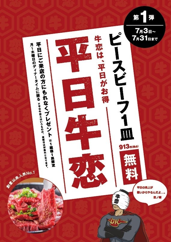 牛恋看板商品「ピースビーフ」はお好きでしょうか。リピーターの皆さんにも、まだ見ぬ未来のお客様にも「赤身焼肉のカリスマ 牛恋」を楽しんでいただくべく、【平日牛恋】として無料プレゼントキャンペーンを決定しました。【平日牛恋】の名を全国へ広げるべく、太っ腹な恋ノ輔は今後も様々な取り組みを計画中。恋ノ輔は皆さんの笑顔が幸せ。今後も赤字覚悟のスペシャルキャンペーンを開催予定ですので、どうぞお楽しみ下さいな…。