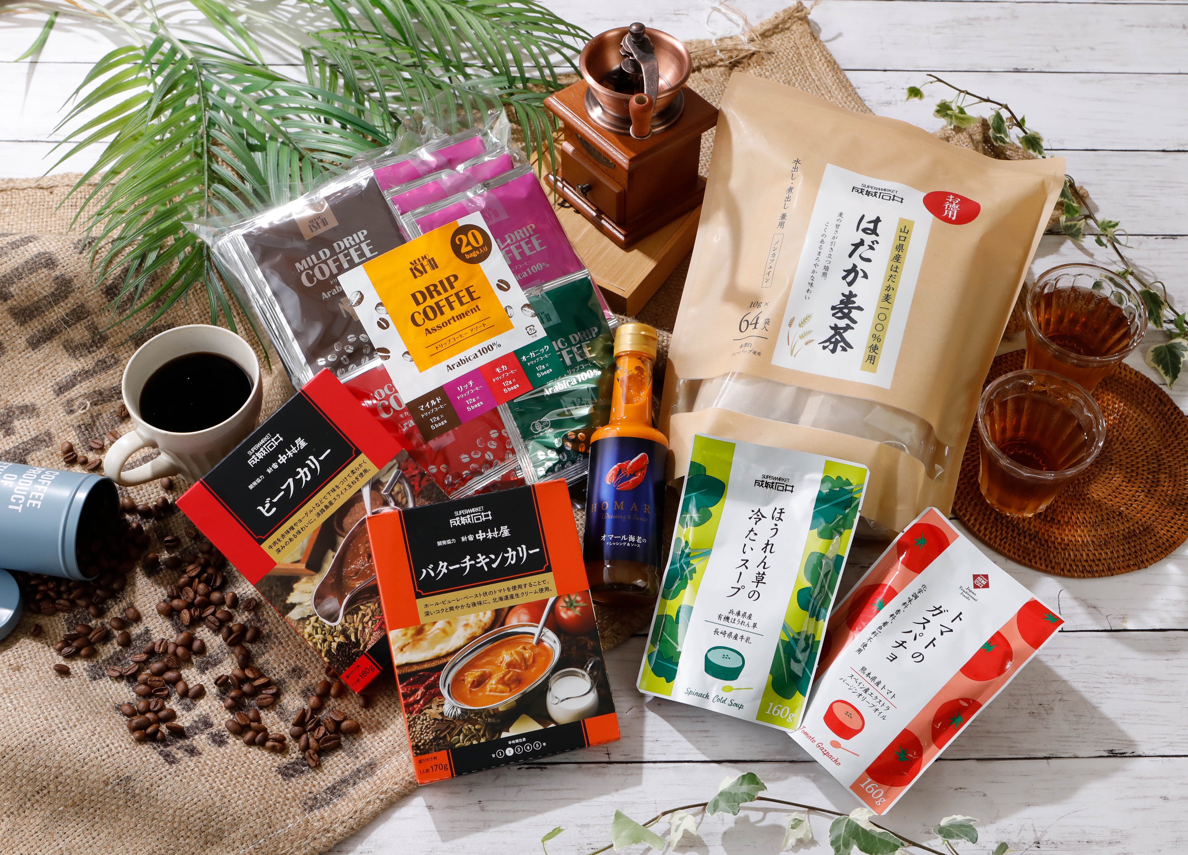 調味料や缶詰、レトルトなど常温加工食品を扱うグロサリー部門。今回は夏にぴったりのスパイスが利いたレトルトカレーをはじめ、爽やかな冷製スープ、まろやかな甘味と香ばしい香りが特長のはだか麦茶など、最新のトレンドを詰め合わせました。日々の食卓でお手軽にご活用いただける成城石井ならではの商品をぜひお楽しみください。
