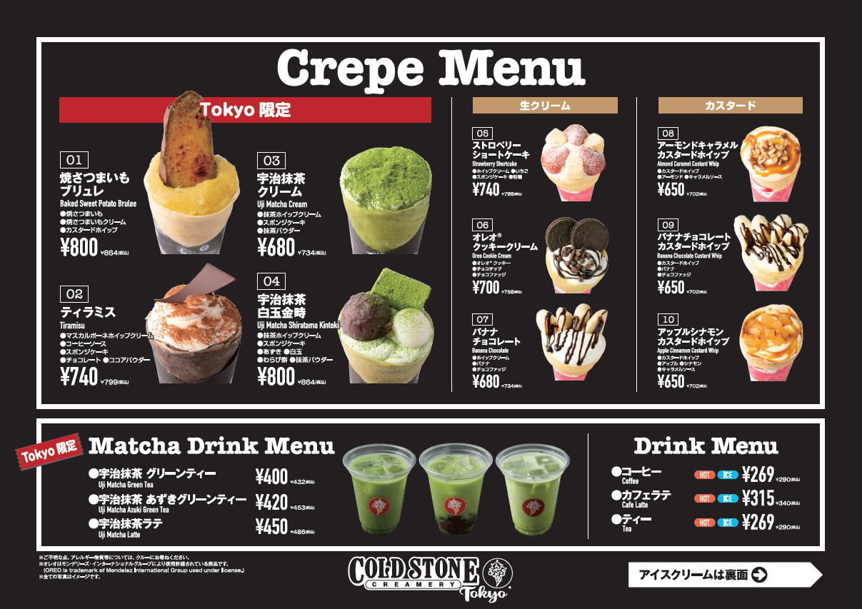 コンパクトな都市型店舗には、定番のクリエーションアイスクリームに加え、お持ち帰り・食べ歩きしやすいクレープなどの商品もご用意。 国産の “さつまいも” 、“抹茶” を使用した 『原宿店舗限定メニュー』 も発売いたします。