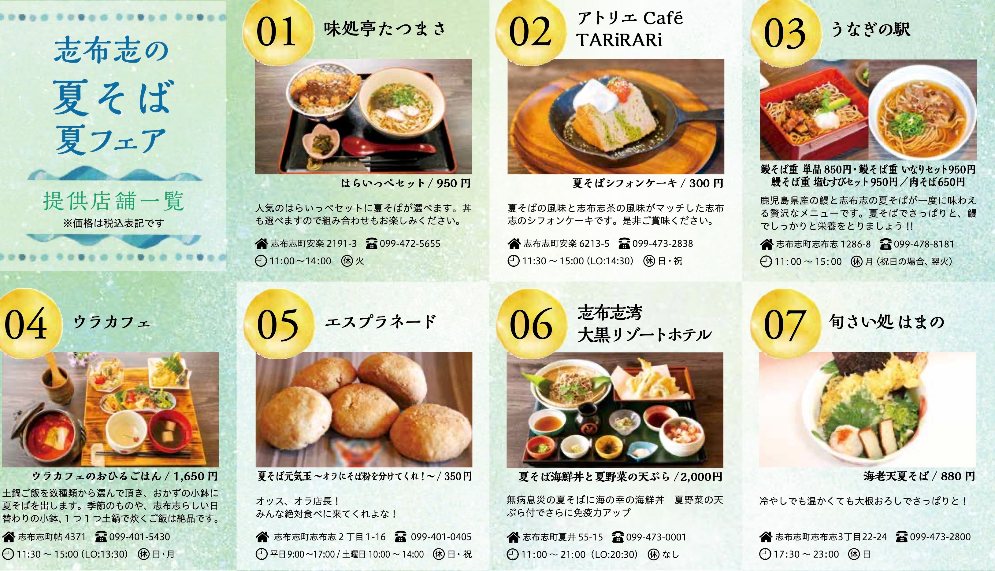 「志布志の夏そば」を含む志布志産の旬の夏食材が勢揃いのうえ、抽選・キャンペーン企画や直接販売、飲食店での特別メニューの提供などを実施します。