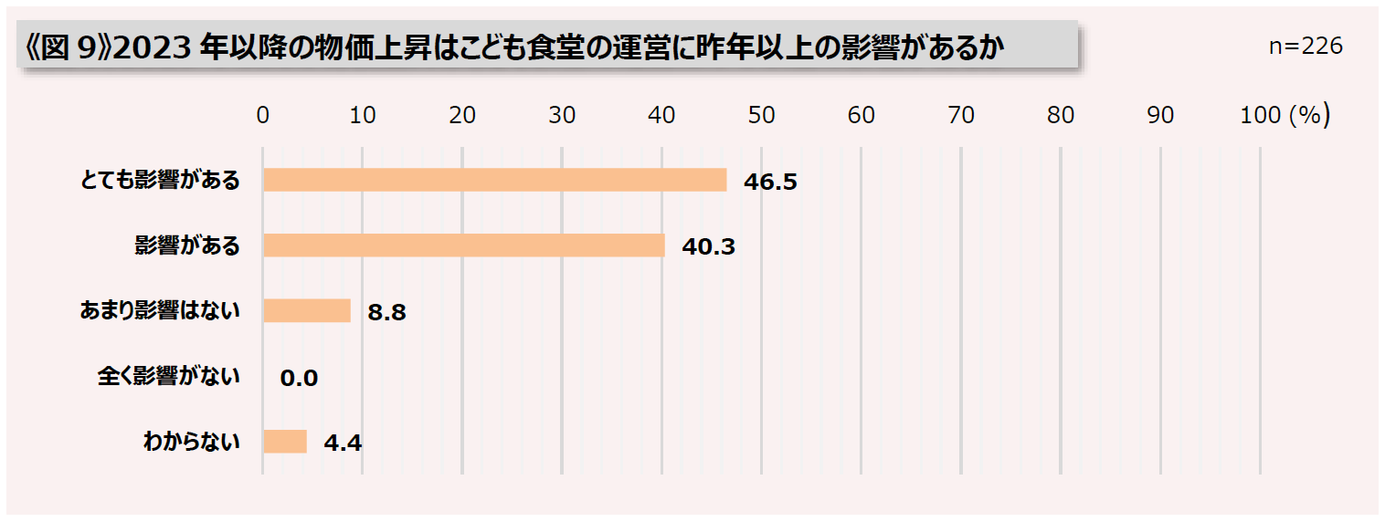また、2023年以降の物価上昇に伴うこども食堂利用者数の変化について聞いたところ、利用する人数が「増えた」と回答した割合が57.5%に上り、こども食堂の必要性が高まっていることを裏付ける結果となりました《図8》。さらに、こども食堂の運営についても、物価上昇が「とても影響がある」と回答した割合が46.5%、「影響がある」と回答した割合が40.3%に上り、物価上昇はこども食堂の利用者数増加だけでなく、運営側にも影響を及ぼしていることがわかりました《図9》。