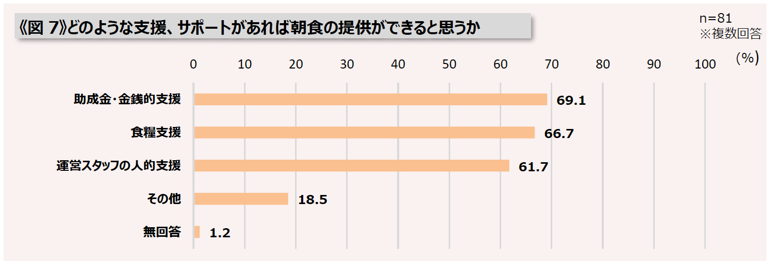 また、図5で「思う」と回答した職員に対し、朝食の提供が出来ていない理由を聞いたところ、最も多かった回答が「運営スタッフの人手不足・人材確保が難しい」(71.6%)、次いで「資金不足」(56.8%)、「食材の確保が難しい」(43.2%)となりました《図6》。またどのような支援、サポートがあれば朝食の提供ができると思うかを聞いたところ、69.1%が「助成金・金銭的支援」、66.7%が「食糧支援」、61.7%が「運営スタッフの人的支援」と回答する結果となりました《図7》。