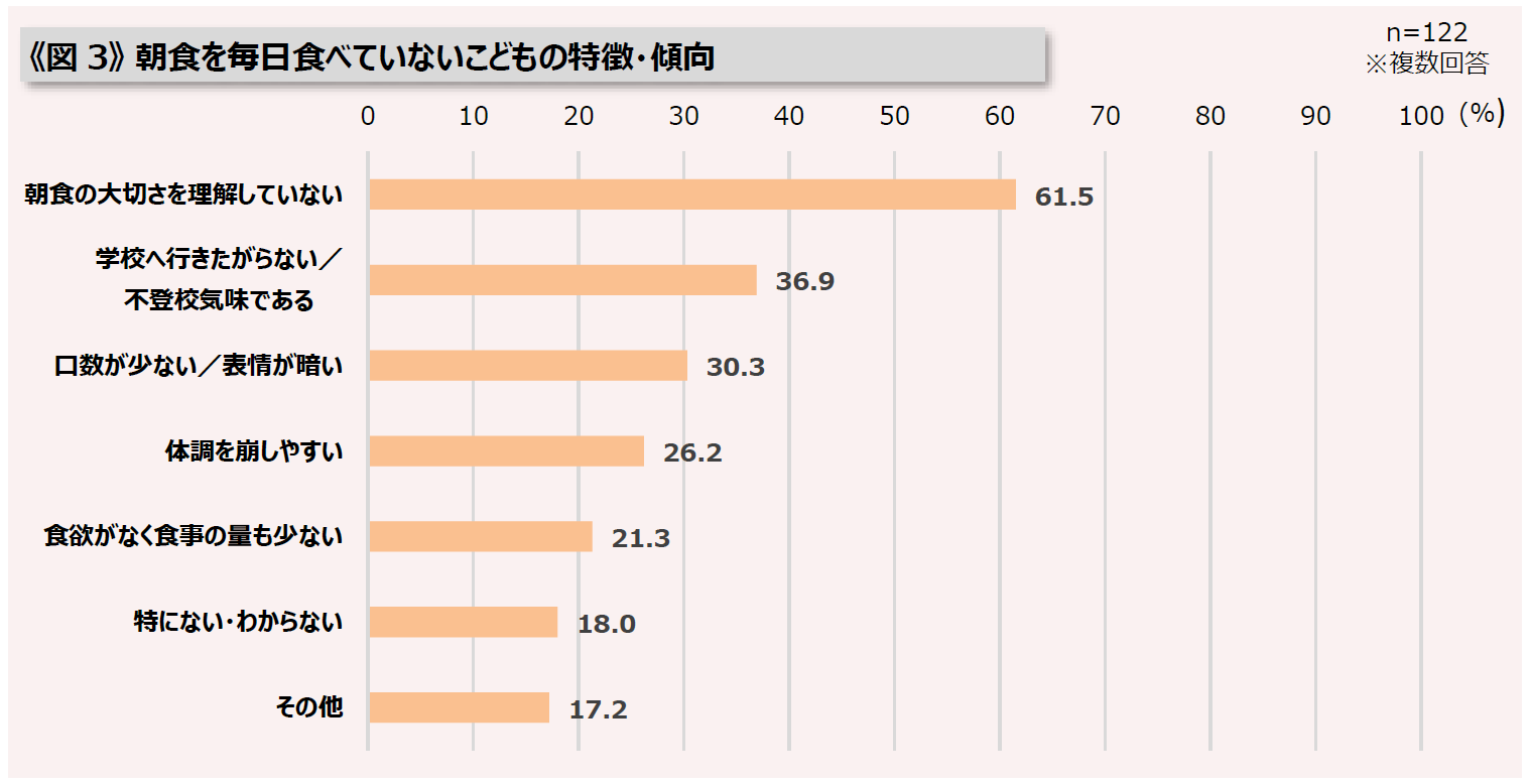 図1で「いる」と回答したこども食堂に対し、朝食を毎日食べないこどもの特徴・傾向を聞いたところ、「朝食の大切さを理解していない」と回答した割合が61.5%と半数を超える結果となりました。さらに、「学校に行きたがらない/不登校気味」(36.9%)、「口数が少ない/表情が暗い」(30.3%)の他、「落ち着きがなく、学力や理解力が低い傾向にある」、「授業に集中するのが難しい」、「怒りっぽい」、「元気がない」、「疲れやすい」など、朝食欠食がこどもたちに様々な悪影響を与えていることが見えてきました《図3》。