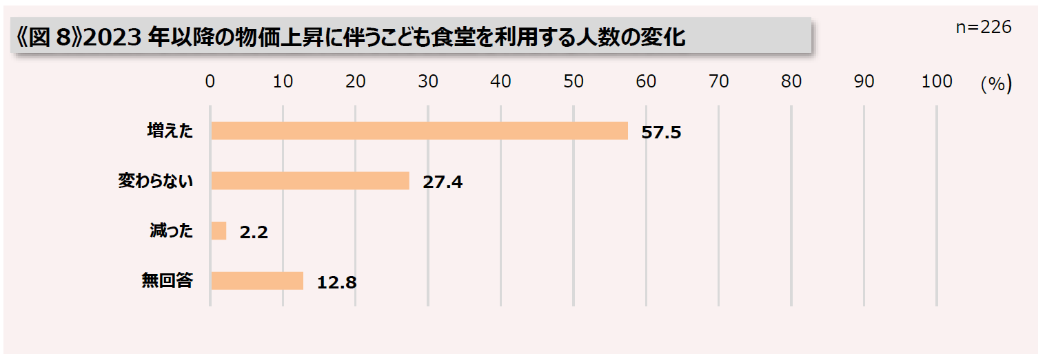 ・2023年になってからの物価上昇により、こども食堂を利用する人数が「増えた」と回答する運営者が半数以上。約9割がこども食堂の運営にも影響を感じている。