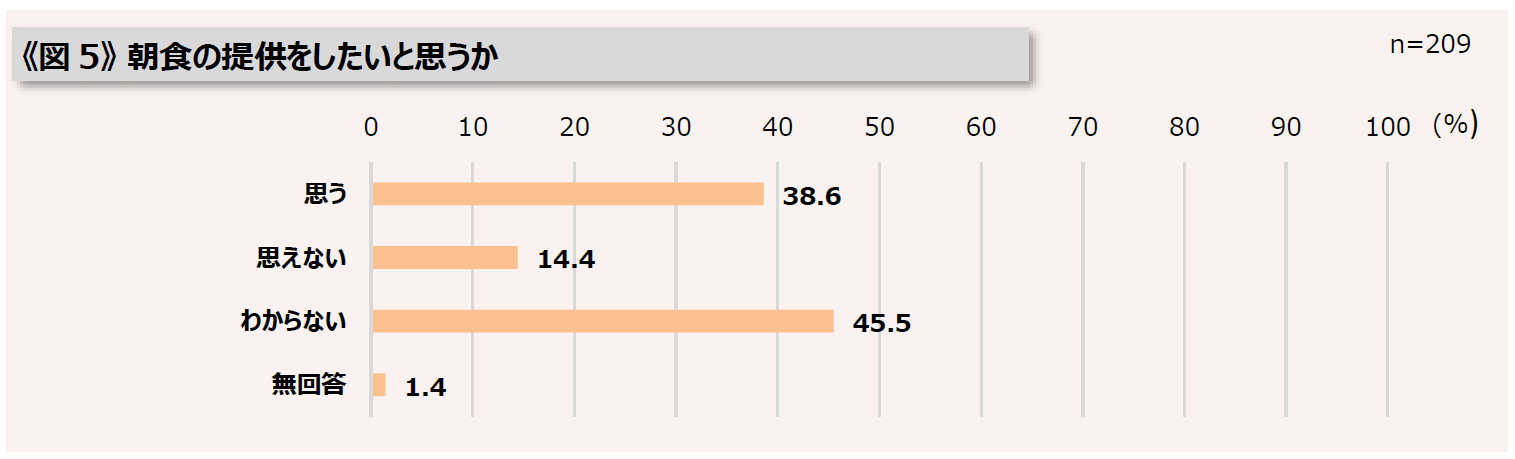 現在こども食堂において朝食提供を「していない」と回答した割合は92.5%となった一方で、朝食を提供していないこども食堂に「今後朝食の提供をしたいと思うか」を聞くと、4割近くに当たる38.6%が「思う」と回答する結果となり、こども食堂でのニーズの高さがうかがえます。多くの運営者が朝食提供を実施したいと考えている一方で、なかなか実行に移せない現状が見えてきます《図4》《図5》。