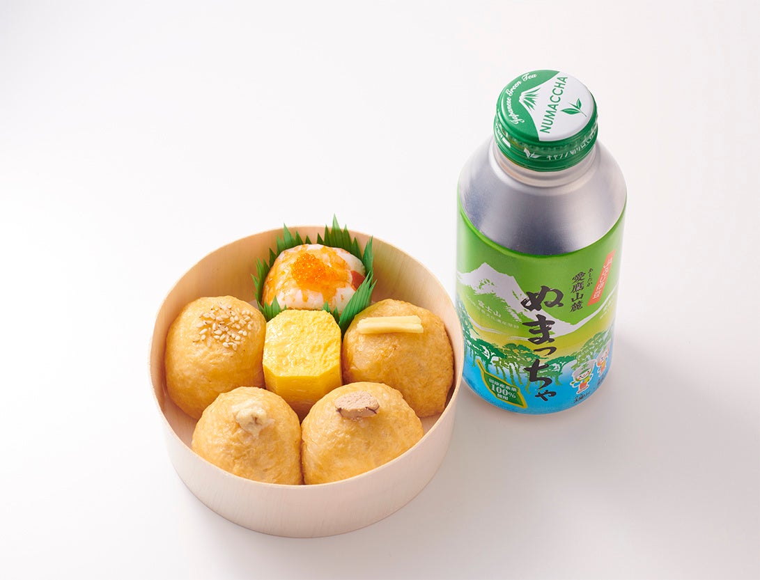 玉いなり4種とえびの手毬寿司に、沼津産茶葉100%使用のお茶付き限定セットです。