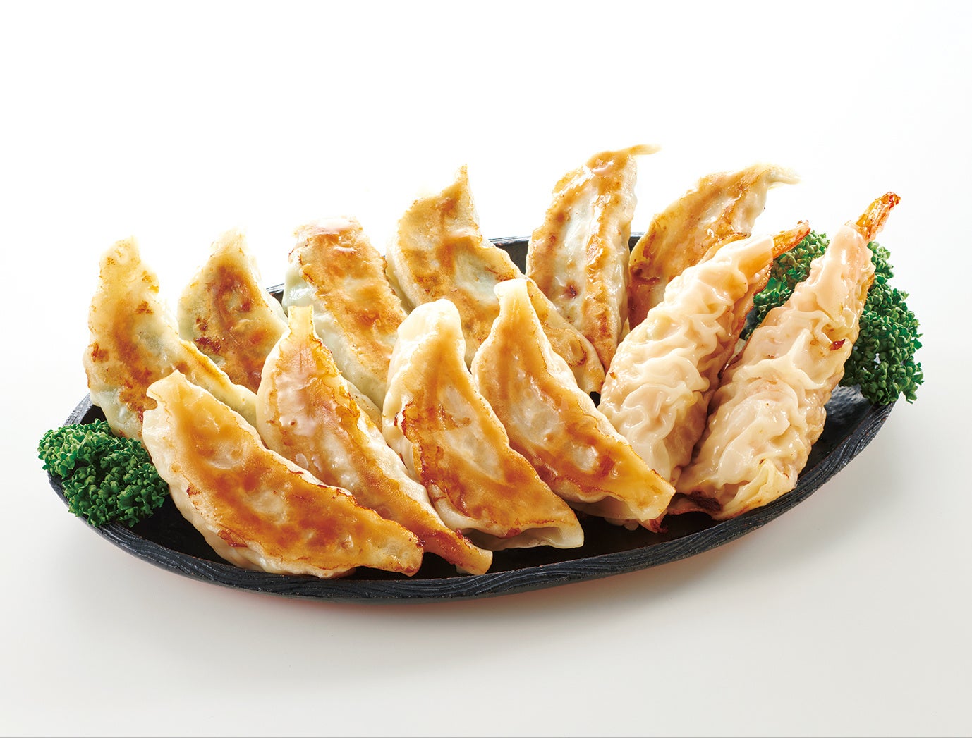 色鮮やかな尾付海老を1本丸ごと使った海老棒餃子2個、定番のハオ餃子4個、しそ餃子4個、にら餃子2個のお買い得な詰め合わせです。