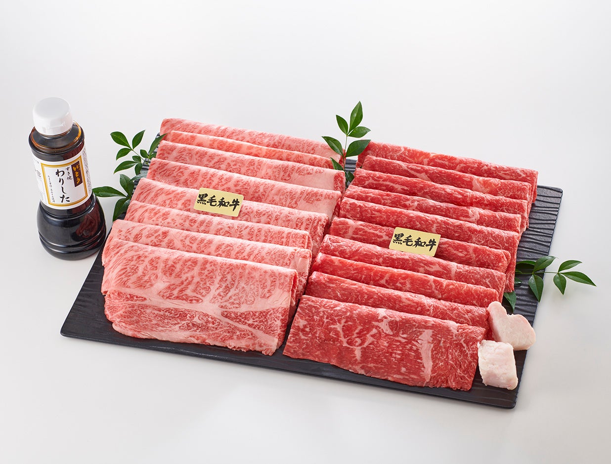 国内産黒毛和牛肩ロースすき焼き用、ももすき焼き用をそれぞれ500gずつ、割り下もセットです。