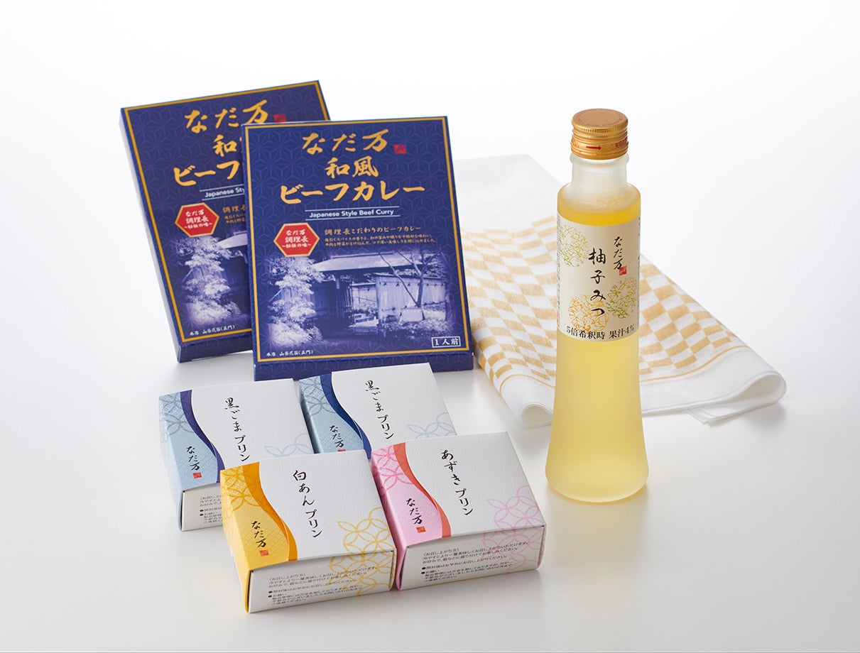 柚子みつ1本、和風ビーフカレー2個、プリン4個の詰め合わせを風呂敷でお包みしてご用意いたします。