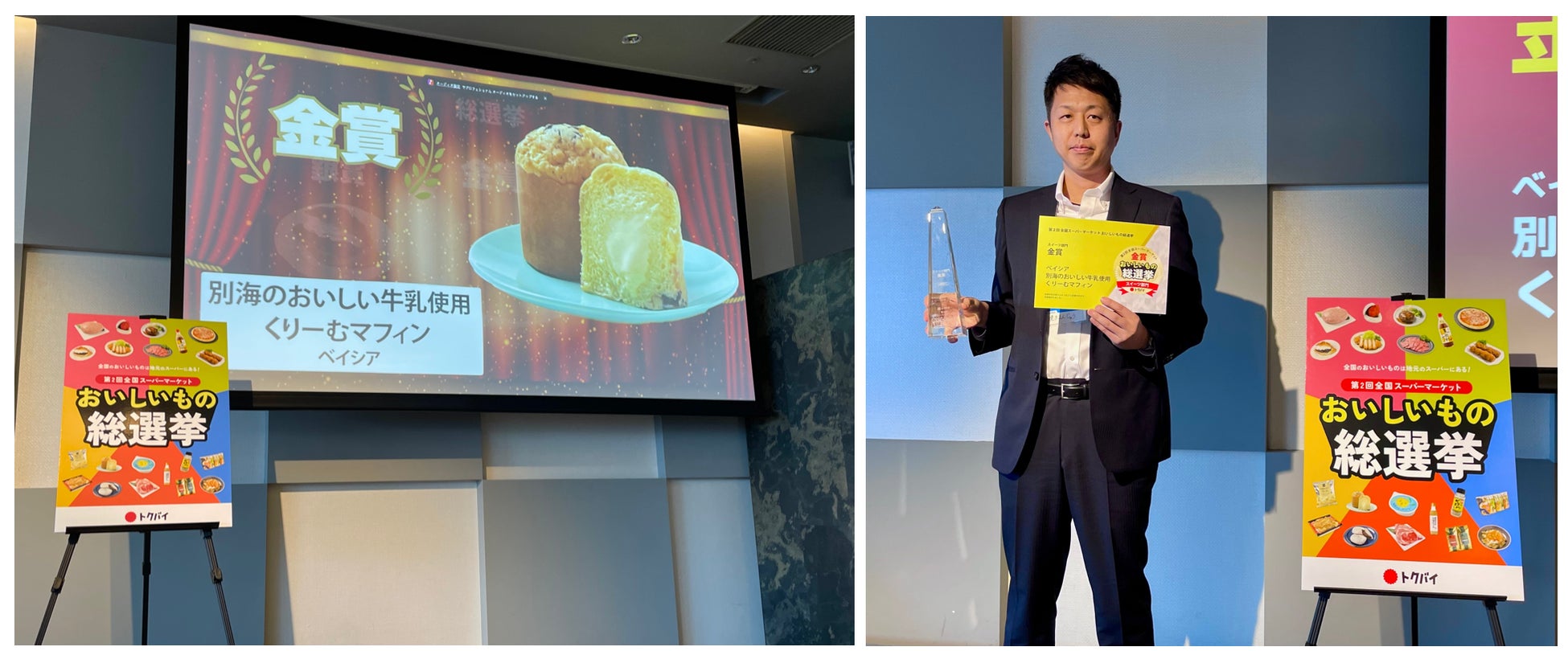 「第二回おいしいもの総選挙」スイーツ部門金賞をいただきありがとうございます。「別海のおいしい牛乳使用 くりーむマフィン」は、ナッツとチョコチップを練り込んだ生地に、産地・生産者を限定した当社人気商品「別海のおいしい牛乳」を使用した特製クリームを内側に入れた新食感マフィンです。冷凍スイーツなので、買い置きができて食べたい時に食べられるといった利点があり、また解凍時間によって異なる2種類の食感をお楽しみいただけます。今後も、「より良いものをより安く」をモットーにお客様に商品をご提供してまいります。