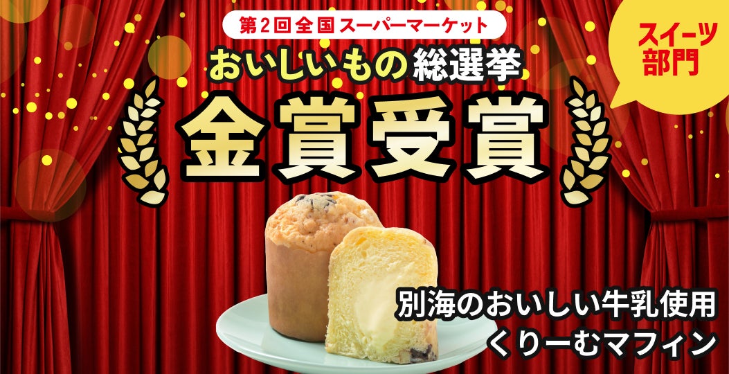 全国スーパーマーケット おいしいもの総選挙は、チラシ・買い物情報サービス「トクバイ」を運営する株式会社ロコガイドが主催する、全国のスーパーマーケットから自慢のお惣菜やスイーツなどを集め、生活者に投票いただく企画です。「スイーツ部門」には全国のスーパーマーケットから28商品のエントリーがあり、『ベイシア 別海のおいしい牛乳使用 くりーむマフィン』が唯一1品のみに贈られる「金賞」に選ばれました。