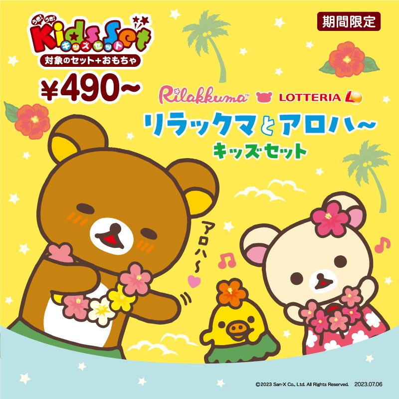 サンエックス株式会社(本社:東京都千代田区代表取締役社長:千田洋史)は、株式会社ロッテリア(本社:東京都港区、代表取締役社長:長久保文康、以下:ロッテリア)と「リラックマ」がコラボレーションしたお子様向け商品企画として、ロッテリアオリジナル『リラックマとアロハ~キッズセット』が2023年7月6日(木)から10月上旬までの期間限定で、全国のロッテリア※1にて販売されることをお知らせします。