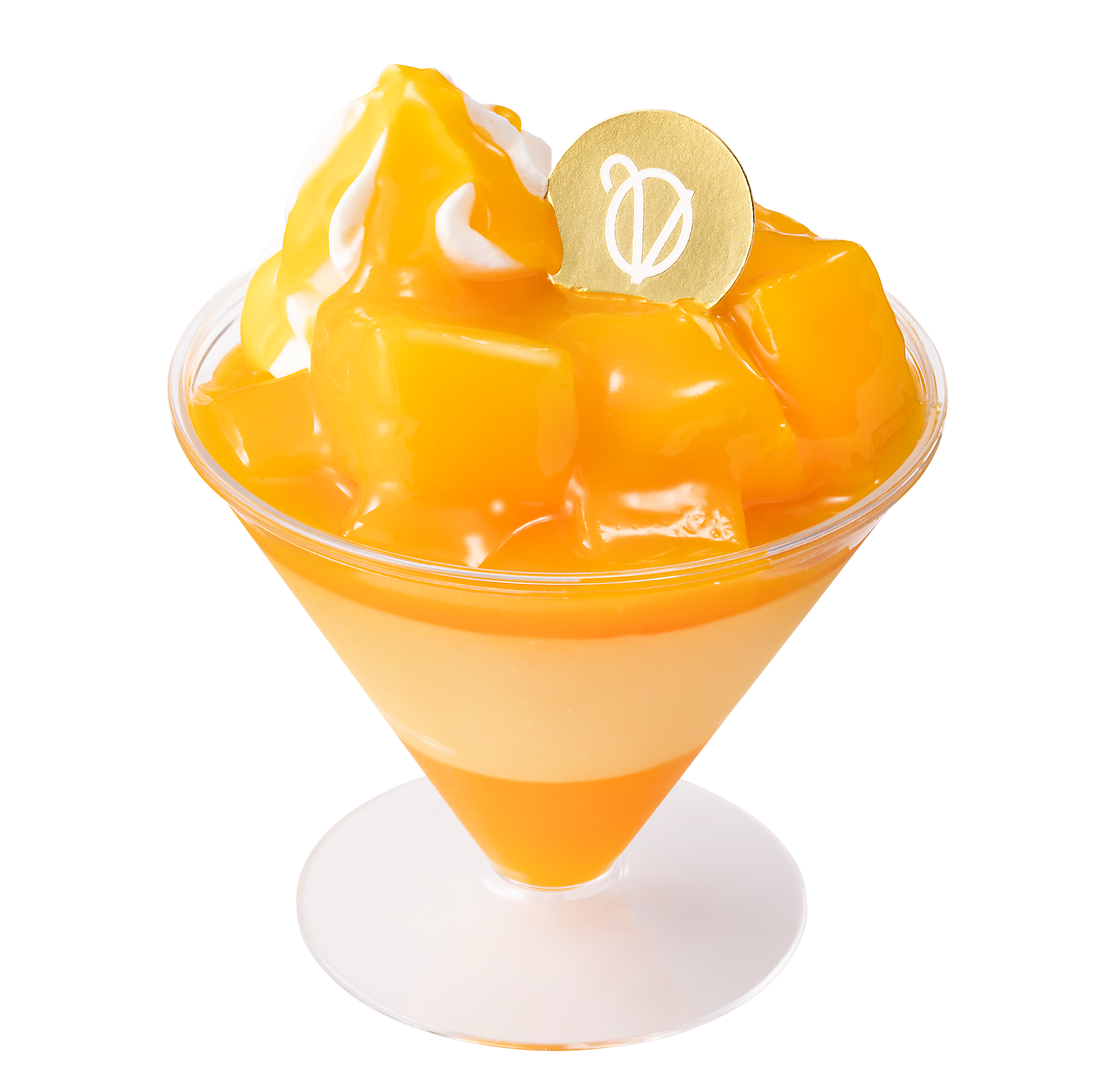 マンゴープリンにマンゴーソースとマンゴーの果肉、マンゴーオレンジゼリーを重ねて。 夏のパフェにふさわしい、黄金に輝くまさにマンゴー尽くしの一品です。