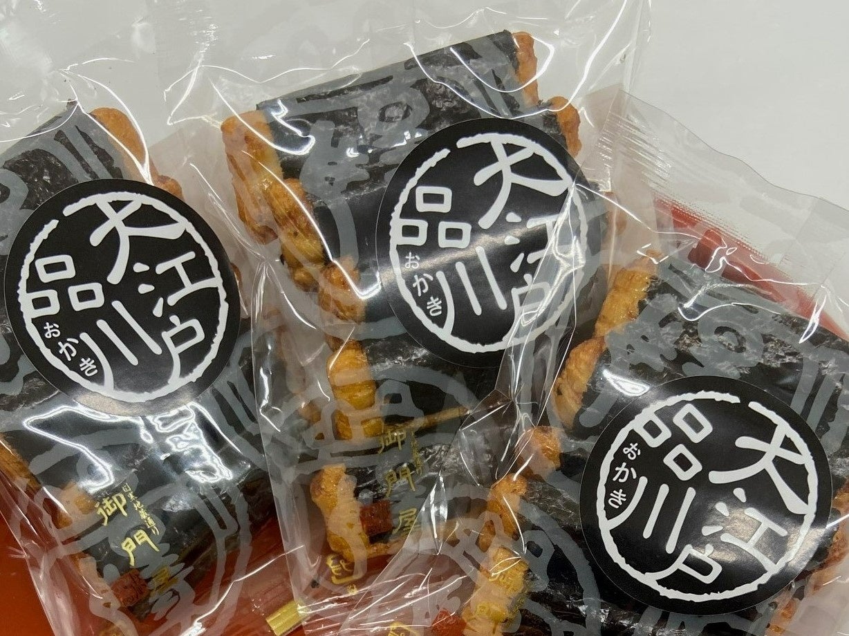 当店自慢の揚もち(醤油)に生海苔を巻き、1袋に5本入った品川限定商品です。さくさくとした食感に海苔の風味が絶品です。