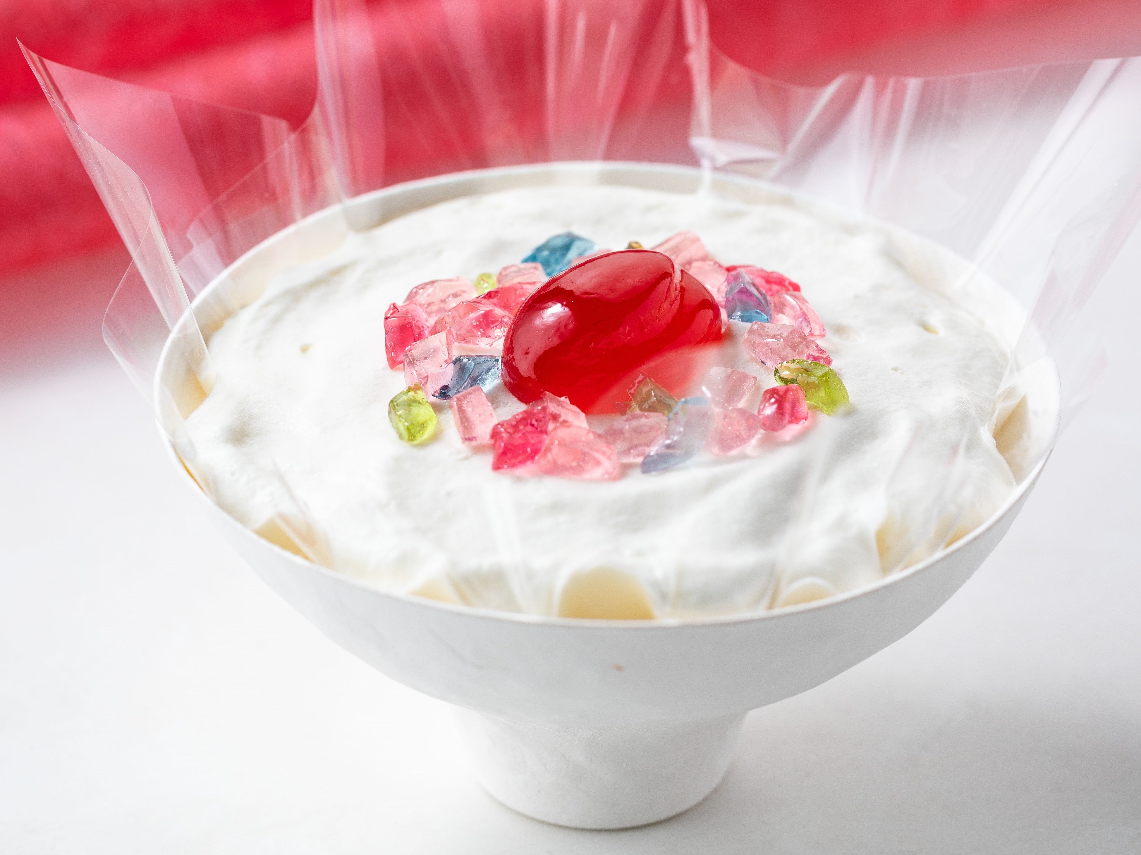 ふわっとみずみずしいフレッシュレアチーズに ルビーラズベリーゼリー&クリスタルレモンゼリー。スプーンですくいあげると真っ赤なベリーソースのリボンがからまります。