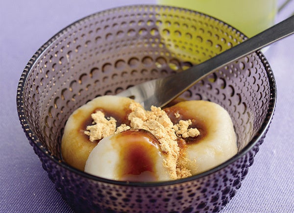 白玉団子を作る要領で、生地をひとまとめにし、熱湯で数分茹でます。きなこと黒蜜をかけてお召し上がりください。