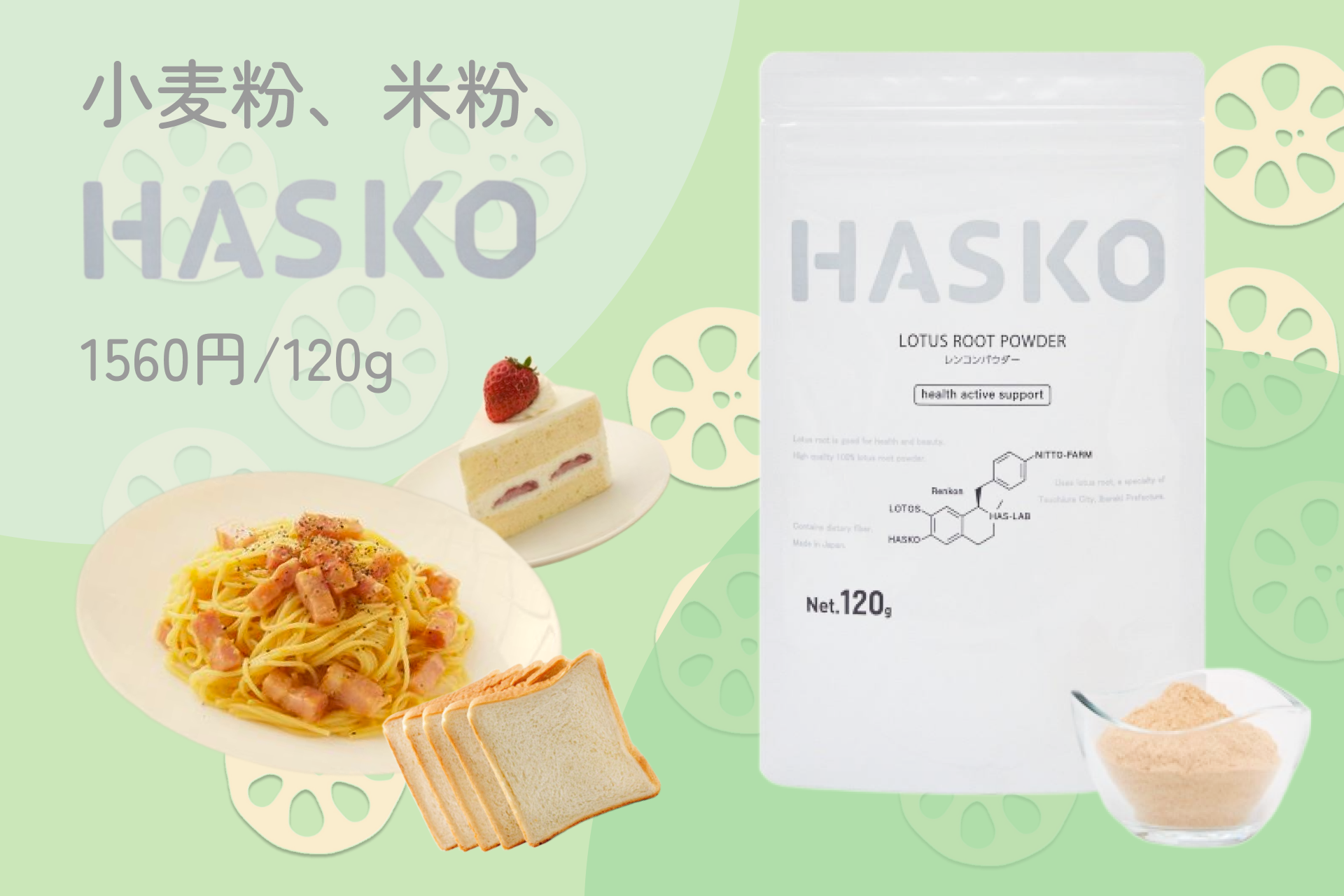 「HASKO(ハスコ)」は、食物繊維を豊富に含むレンコンを特殊な低温乾燥で粉末化したもので、小麦粉の代替品として日常のお料理やお菓子作りなどにご活用いただけます。