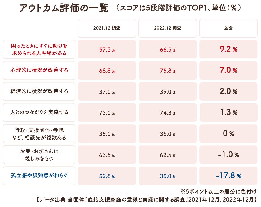 私たちが実施した「直接支援調査(2022年12月)」の各項目のスコアの推移を見ると、「困ったときにすぐに助けを求められる人や場がある」と「心理的に状況が改善する」の2項目はスコアの上昇が見られ、反対に「孤立感や孤独感がやわらぐ」は大幅にスコアが低下しています。