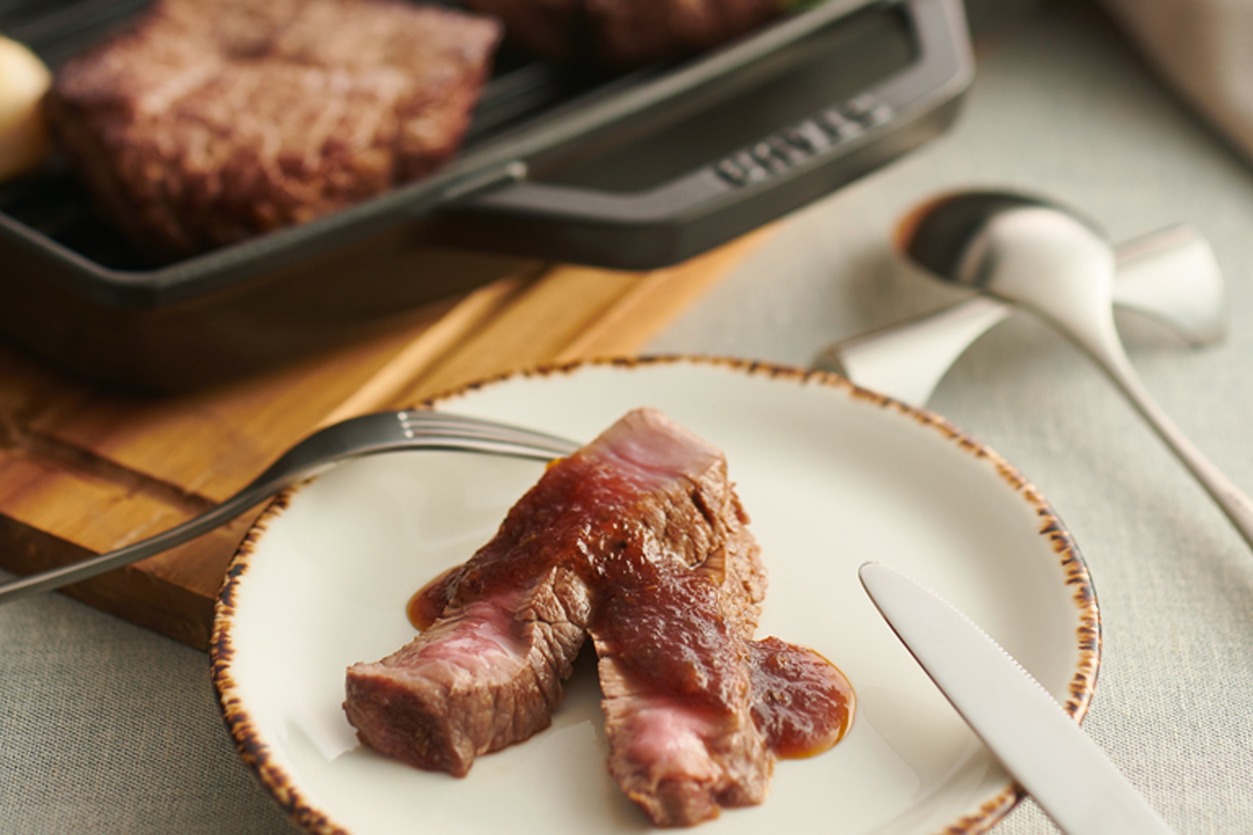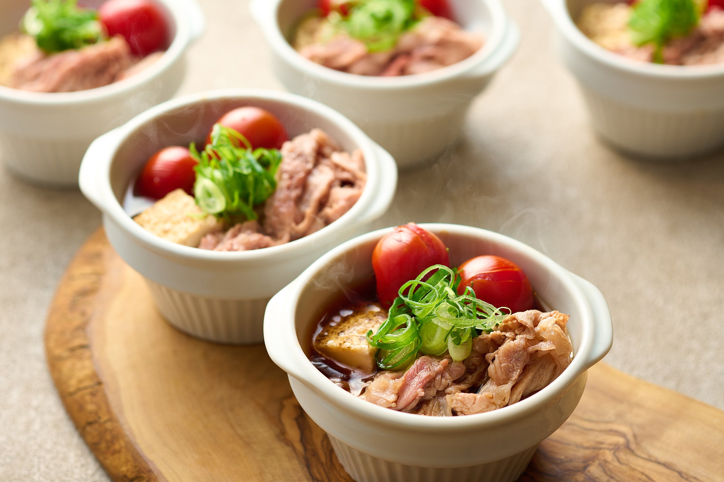 甘辛の割り下で煮込んだ和牛に九条ねぎをトッピング。トマトのほどよい酸味でさっぱりと仕上げています。あつあつのココットで提供します。