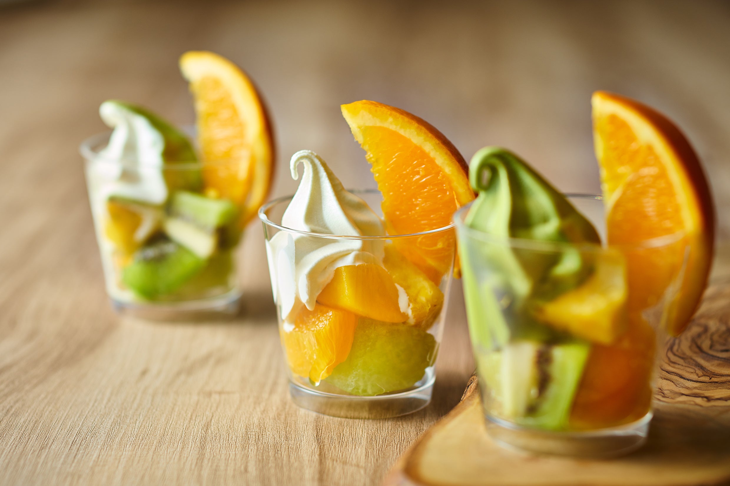 ソフトクリームは2種類をご用意しています。季節のカットフルーツと合わせて自分だけのオリジナルパフェをお楽しみいただけます。