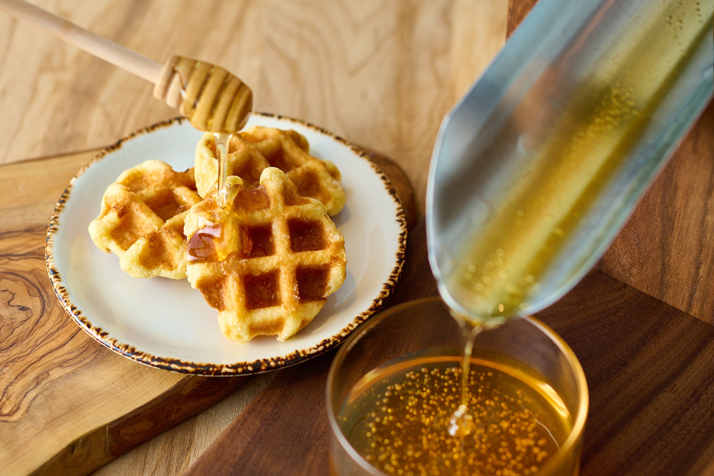 蜜蝋から抽出された加熱処理を加えないアカシアはちみつです。ワッフルやトーストはもちろん、ヨーグルトやシリアルにもおすすめです。