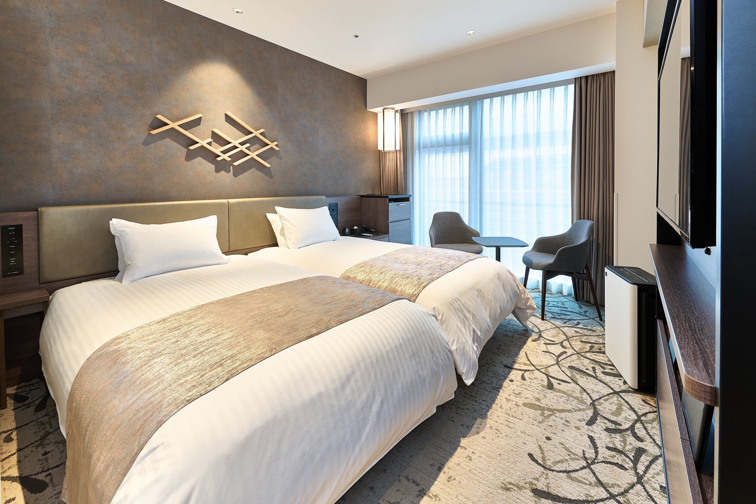 客室にはホテルグランヴィア京都と同グレードのシモンズ社のマットレスやオリジナルベッドアイテムを使用し、上質な「眠り」を提供します。一部のフロアにはセキュリティ扉で区画した女性専用の客室ゾーンを設け、レディースルームを配置し、女性に嬉しい設備をご用意しています。