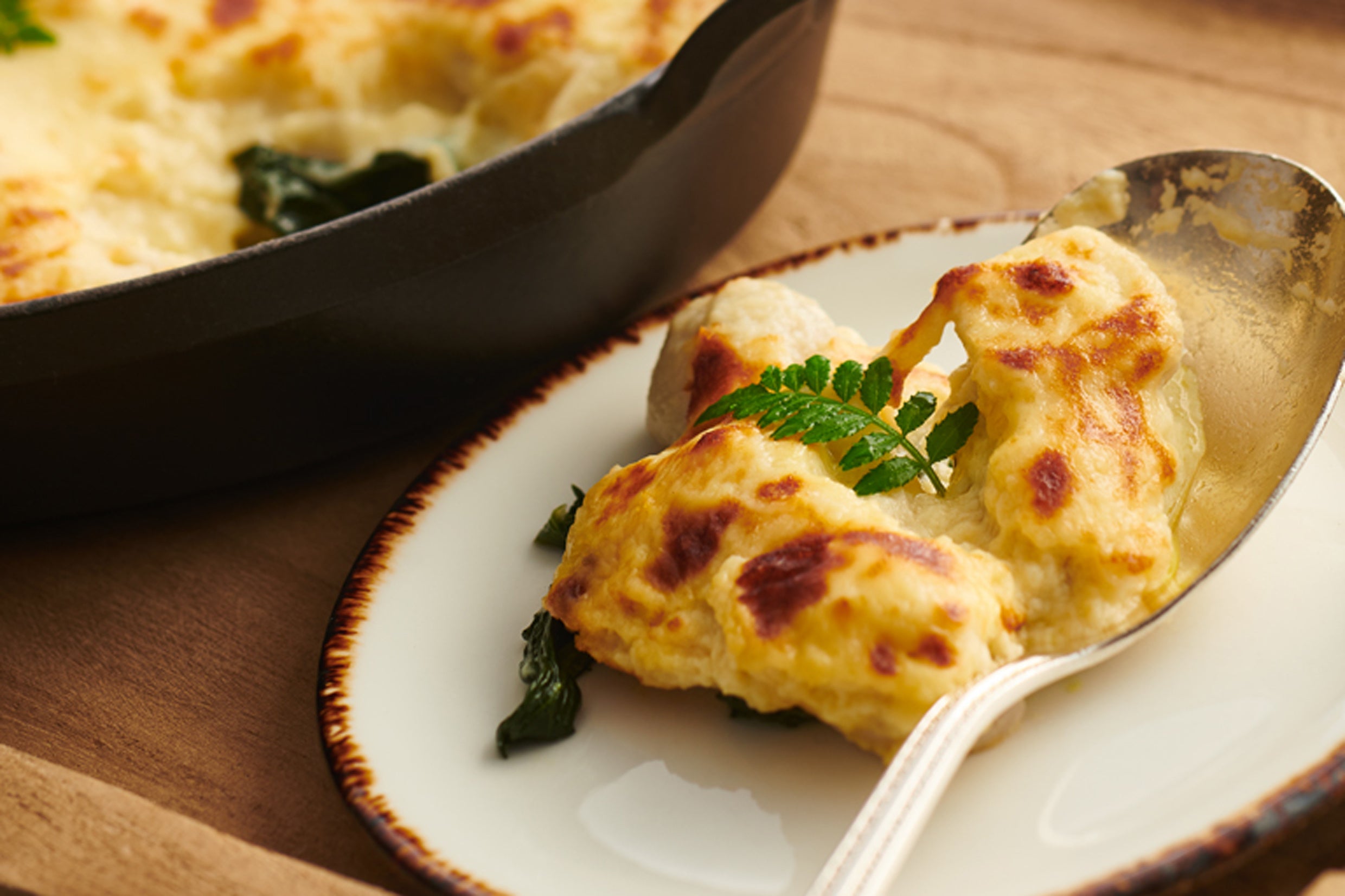 京都水尾の柚子胡椒と白味噌を合わせたベシャメルソースに、京都の老舗「半兵衛麩」のなま麸と里芋をしのびこませました。京都食材との新しい出会いを発見できる一品です。